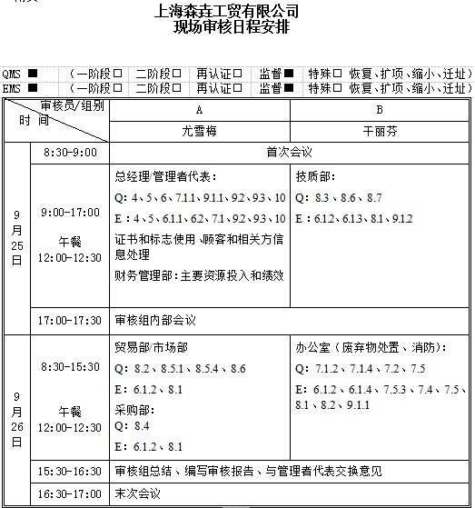 本月的25號和26號我們將迎來質量管理體系和環境管理換版后的第一次外部審核。具體審核的安排如下: