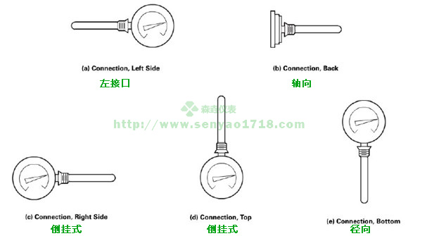 為了適應(yīng)實際生產(chǎn)的需要,雙金屬溫度計具有不同的安裝固定形式:可動外螺紋管接頭、可動內(nèi)螺紋管接頭、固定螺紋接頭、卡套螺紋接頭、卡套法蘭接頭和固定法蘭。