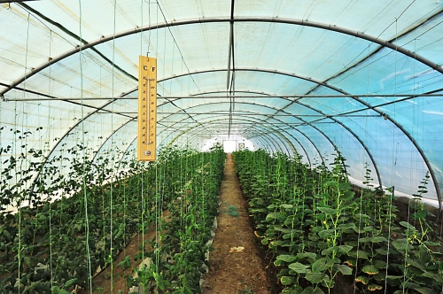 大棚內氣溫日變化趨勢與陸地相同,但晝夜溫差變幅大。白天光照充足,如果薄膜密閉棚內溫度升高很快,最高可達40─50℃,比棚外高20℃以上。陰雨天,增溫效果差,夜間棚內最低氣溫一般比棚外高1─3℃。棚內地溫比氣溫穩定,通常為10─20℃。棚內氣溫也因位置不同而異,大棚橫向分布為中間高、兩邊低,因此大棚中部的植株往往比兩邊的植株高大。大棚縱向分布,白天有太陽照射時,溫度為頂部高、下部低,夜間、陰天則相反。