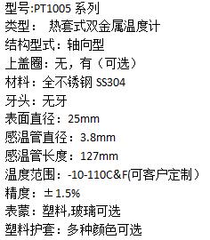 口袋式雙金屬溫度計,使用時一般放在食物上,所以也叫食品溫度計。市面上常用的型號有PT1005、PT2008、PT2005等類型都屬于口袋式雙金屬溫度計。