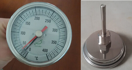 接到電話,這個(gè)客人一開口就說:你們的雙金屬溫度計(jì)能不能直接放在鍋爐里使用?而且要記錄溫度的最高點(diǎn)!乍一聽,有點(diǎn)暈,溫度計(jì)不是安裝在鍋爐上使用的嗎?放在鍋里怎么使用?最后聽客人解釋才知道,他的這個(gè)鍋爐在設(shè)計(jì)的時(shí)候沒有設(shè)計(jì)安裝的接口,導(dǎo)致現(xiàn)在沒有辦法安裝溫度計(jì)測(cè)量溫度,聽了客人的解釋后,才明白怎么一回事!原來客人是要測(cè)量鍋爐內(nèi)的氮?dú)獾臏囟?,溫度要達(dá)到400C的高溫,要密封測(cè)量,還要記錄溫度計(jì)達(dá)到的最高點(diǎn)!最后推薦使用了如下規(guī)格的留點(diǎn)雙金屬溫度計(jì):