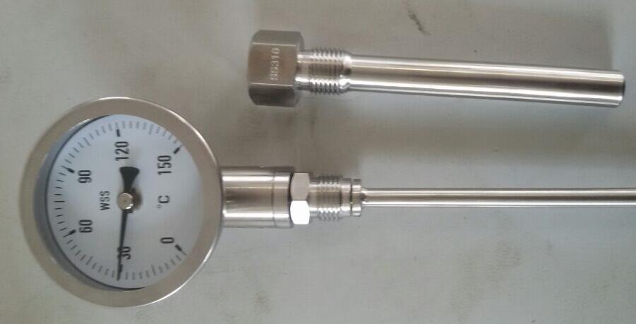 ④熱套式溫度計使用過程中遇到損壞需要更換時,則只需逆時針松動螺母,然后旋出表芯,保護套留在設備中,然后將新的表芯裝入,勿使雙金屬螺旋管與保護套底部接觸,旋緊螺母即可。