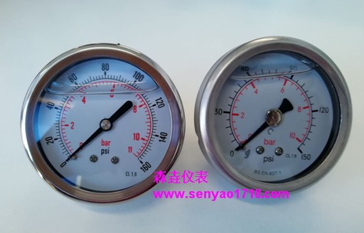 耐震壓力表主要加甘油和硅油兩種。液體能對強震起到有明顯的緩沖作用。甘油:主要是抗震作用;硅油:也是抗震作用,不過硅油要比甘油耐低溫,若室外-20℃,甘油就結晶了,但是硅油還能使儀表正常工作。
